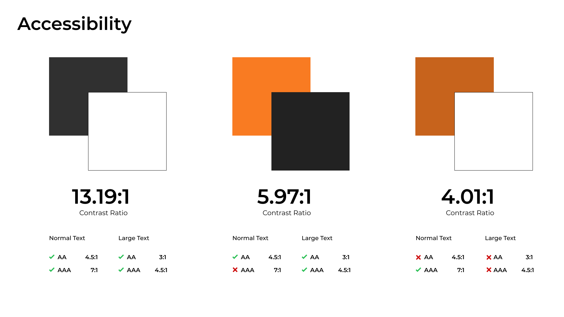 Considering Accessibility during product design is paramount. I prioritized inclusivity in my color combination by verifying their compliance with standard contrast ratio tests, whether it be for normal text, large text or graphics.
